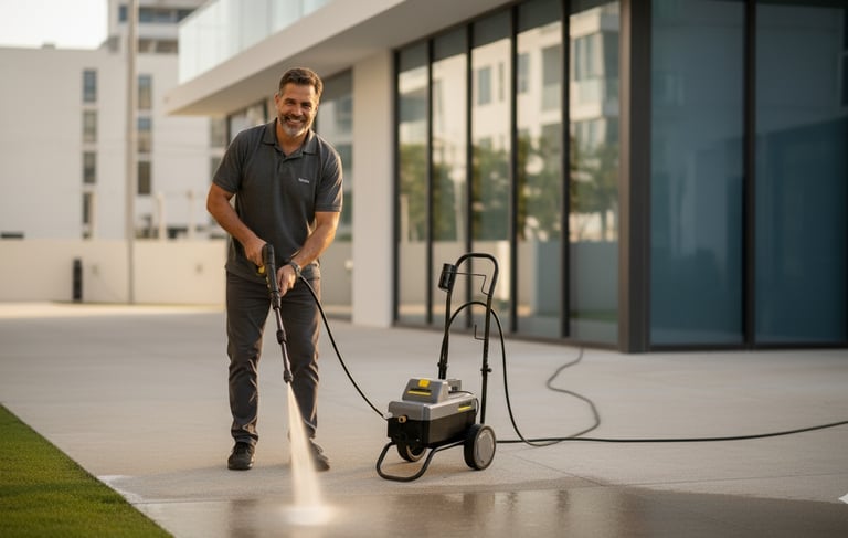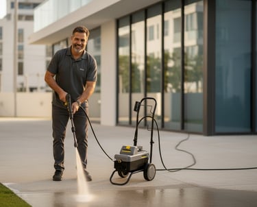 Limpeza Pesada: Realizamos lavações de garagens e calçadas com operador extra, garantindo a manutenção e valorização de áreas de grande circulação.